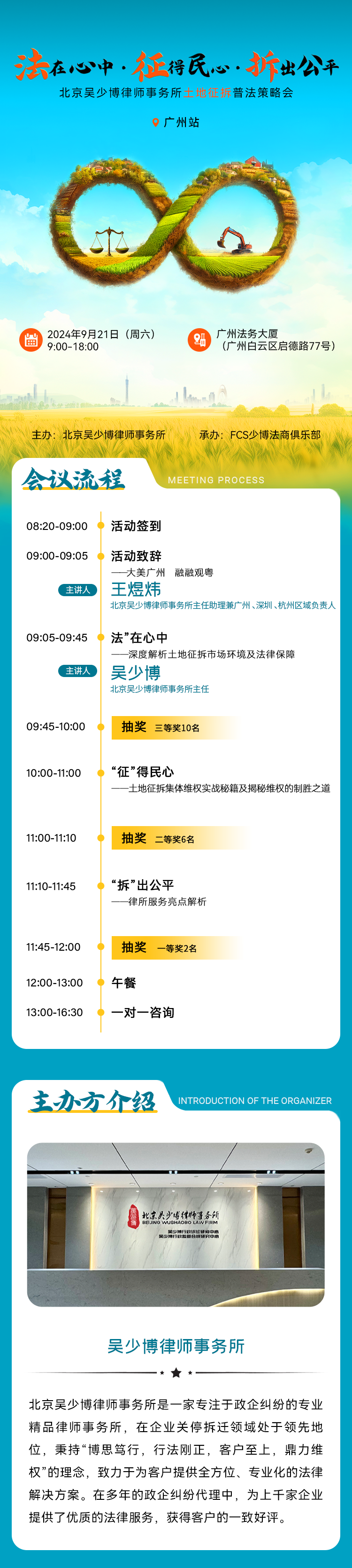 在这个快速发展的时代,城市建设与土地资源的优化配置成为推动社会进步的重要力量。然而,土地征收与拆迁工作作为这一过程中的关键环节,其合法性、公正性及民众权益的保障,始终是社会各界关注的焦点。为此,北京吴少博律师事务所,作为国内知名的专业土地征拆法律服务品牌,特此举办“法在心中 · 征得民心 · 拆出公平”土地征拆普法策略会广州站,旨在为广大市民及企事业单位搭建一个深入了解土地征拆法律环境、学习维权知识的平台。