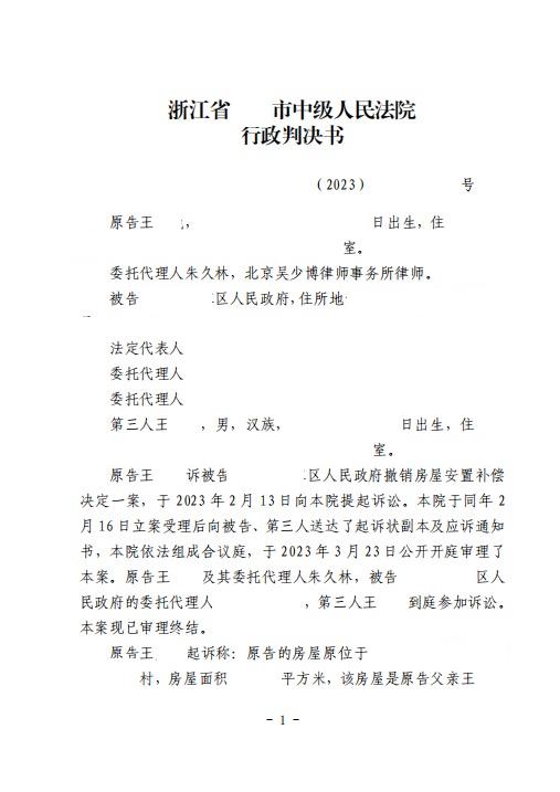 老王早年从浙江某乡村居民那里购得了一幢三层住宅,作为居住之用,并顺利完成了房屋产权的合法登记。随着时间的推移,老王主动提出分家并将该住宅赠予自己的女儿小王。而伴随着的城中村改造,被赠予的老房子也被划归为征拆范围内。2013年,小王代表家庭,与当地政府征拆部门签署了《城中村改造房屋拆迁协议书》(以下简称“拆迁协议”),协议中明确承诺在支付相应拆迁补偿金外,还将为小王提供住房安置。而这所谓的安置房,却迟迟没有落实到位。为此,小王多次主动协商,与政府征拆工作人员沟通交流,希望安置房可以按照先前签订的《拆迁协议》落实下来。而在多次的交涉过程中,政府单方面变更了《拆迁协议》,表示小王并非农业户口,其父亲虽然不是本村人士,但征收方依然对其补偿了相应的宅基地,故小王已不属于本次拆迁的补偿对象,取消了小王的安置房资格。面对此变故,小王深感仅凭协商已难以解决问题,遂决定借助法律武器,聘请北京翰汇律师事务所的朱久林律师作为法律顾问,正式开启维权之路。