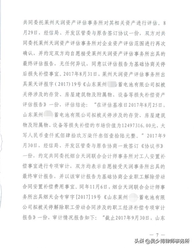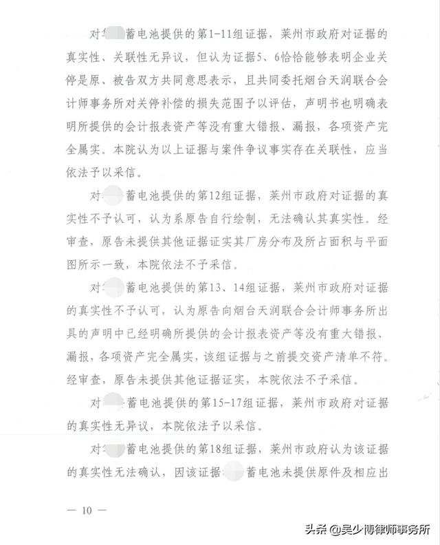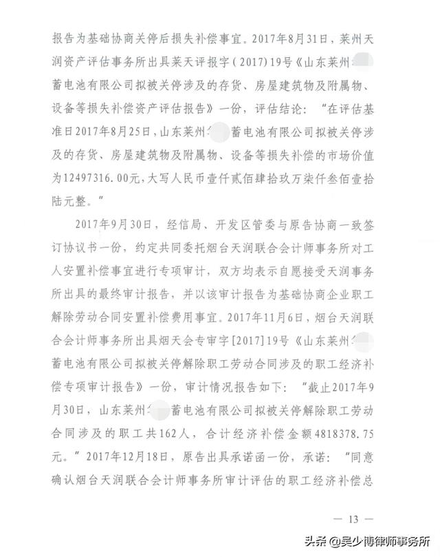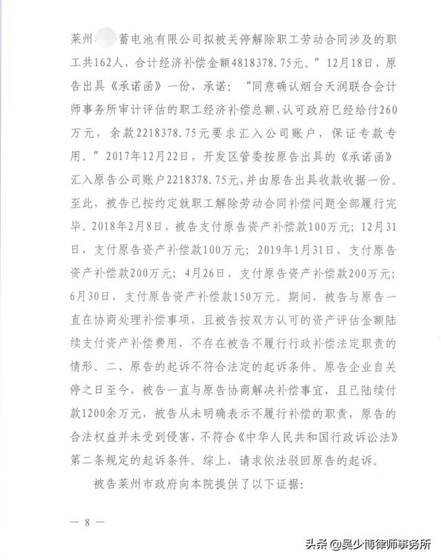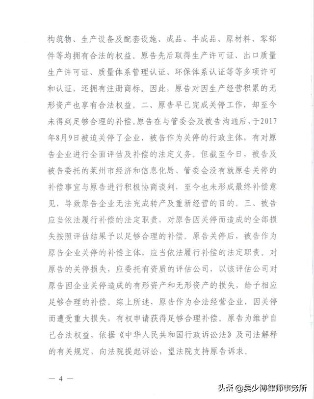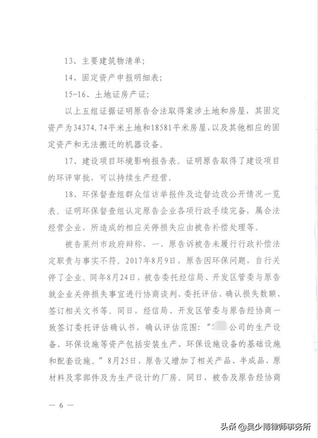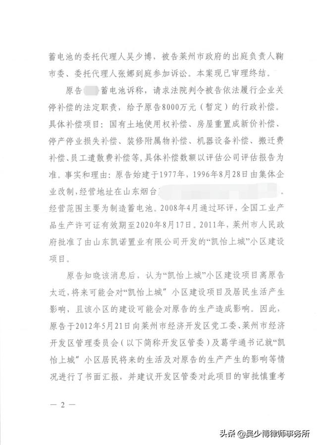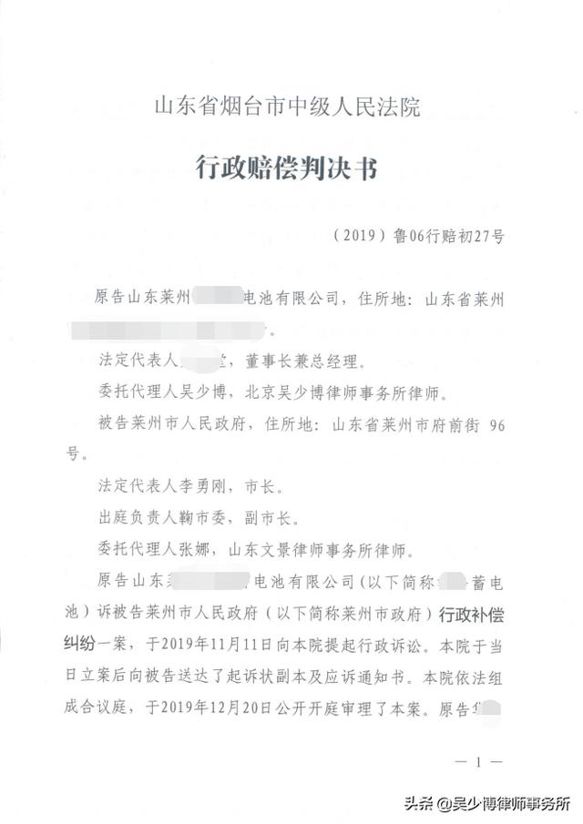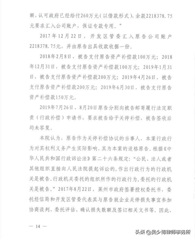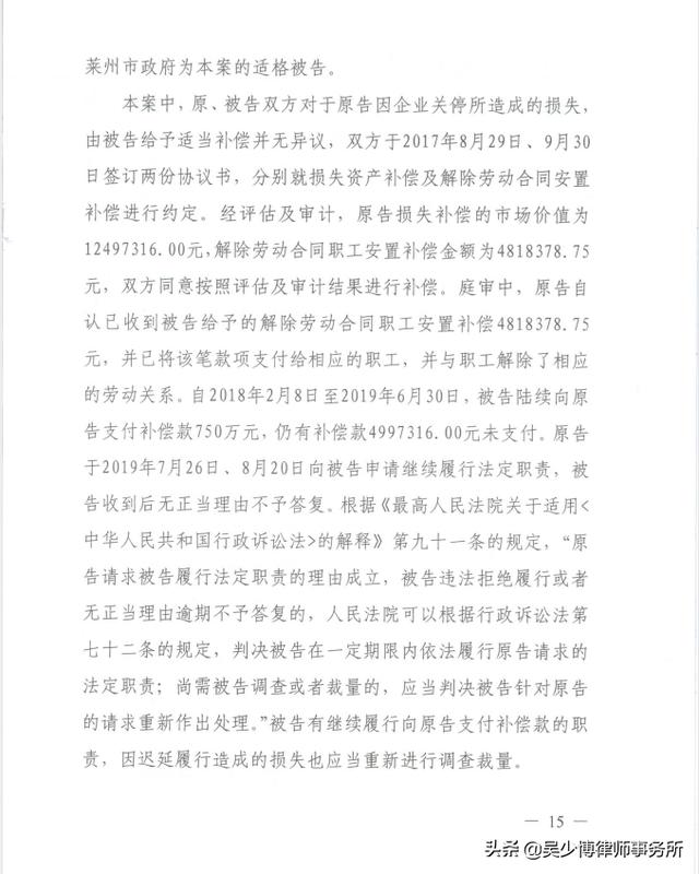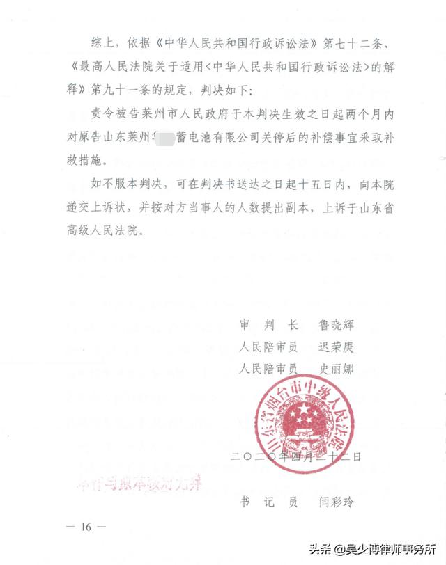 综上,依据《中华人民共和国行政诉讼法》第七十二条、 《最高人民法院关于适用<中华人民共和国行政诉讼法>的解|释》第九十一条的规定,判决如下:责令被告莱州市人民政府于本判决生效之日起两个月内对原告公司关停后的补偿事宜采取补救措施。