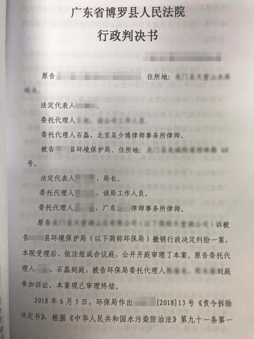 广东水源地环保关停案 撤销责令拆除通知书_石磊胜诉